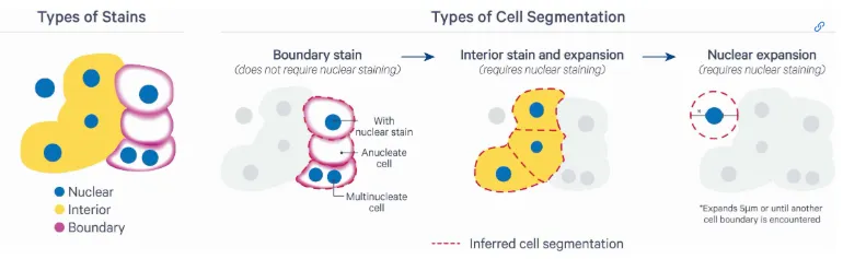对于每个细胞,然后按以下三种方式之一(按优先级顺序)获得分割结果:(i)细胞表面标记抗体靶向上皮( E-Cadherin )和免疫细胞( CD45 );(ii)核扩展至内部边缘染色( 18S rRNA );以及(iii)核扩展固定距离(自 v2.0 起为 5 μm,此前为 15 μm),或直到遇到另一个边界。