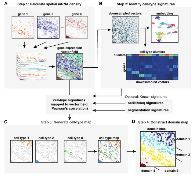 ssam 首先通过高斯核的核密度估计(KDE)计算 mRNA 强度分布。这些分布被解析到像素级别,并堆叠成基因表达向量场。所得表征可用于聚类并注释像素,识别组织域(即“细胞”类型组成均一的区域)。