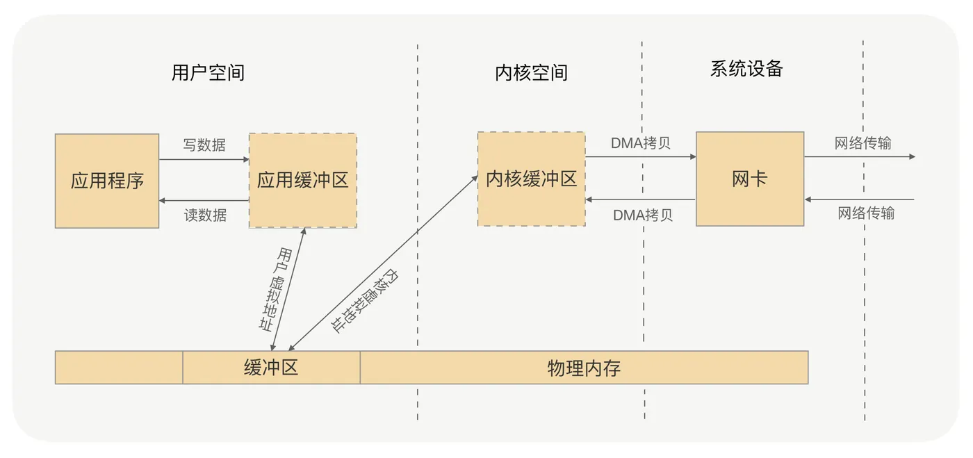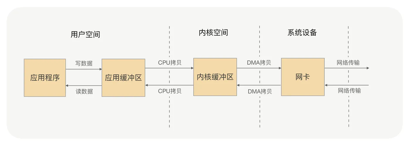 应用进程的每一次写操作,都会把数据写到用户空间的缓冲区中,再由 CPU 将数据拷贝到系统内核的缓冲区中,之后再由 DMA 将这份数据拷贝到网卡中,最后由网卡发送出去。这里我们可以看到,一次写操作数据要拷贝两次才能通过网卡发送出去,而用户进程的读操作则是将整个流程反过来,数据同样会拷贝两次才能让应用程序读取到数据。