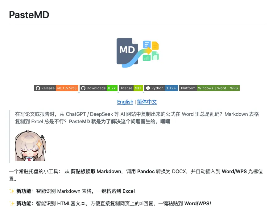 PasteMD 是一个开源的托盘小工具:从剪贴板读内容,调用 Pandoc 转成 DOCX(或表格),然后自动插入到 Word/WPS/Excel 的光标位置。 它主要解决的就是:AI 对话/网页复制出来的 Markdown、富文本、LaTeX 公式、表格,粘贴到 Office 里经常“格式碎一地”的问题。