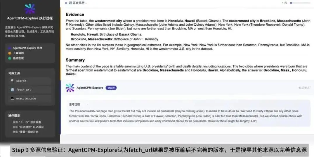 在深度探索任务中,AgentCPM-Explore 打破了小模型“只会死记硬背”的刻板印象。如视频所示,面对“美国历届总统的出生地中,哪两个城市之间东西相距最远?”这一复杂难题,它像一位经验丰富的人类研究员一样思考: