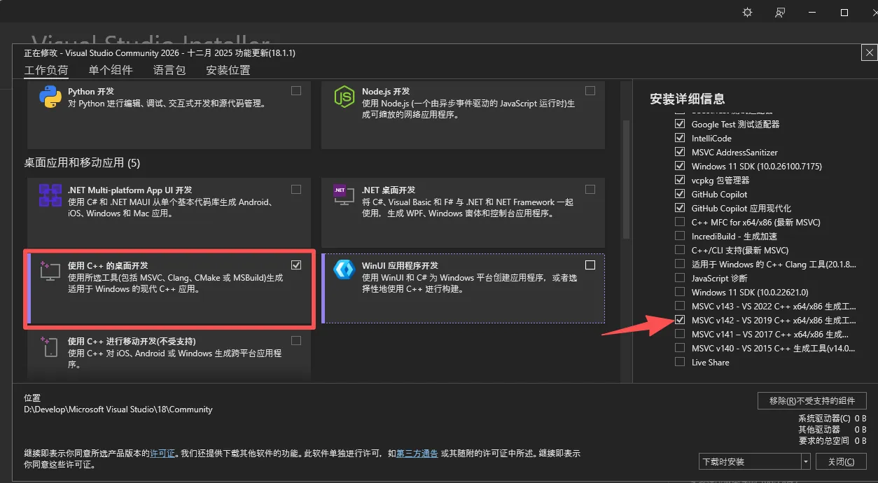 解决方法:Visual Studio Installer中修改→使用C++的桌面开发→MSVC v142-VS2019(根据你报错选择对应的MSVC版本)如图下: