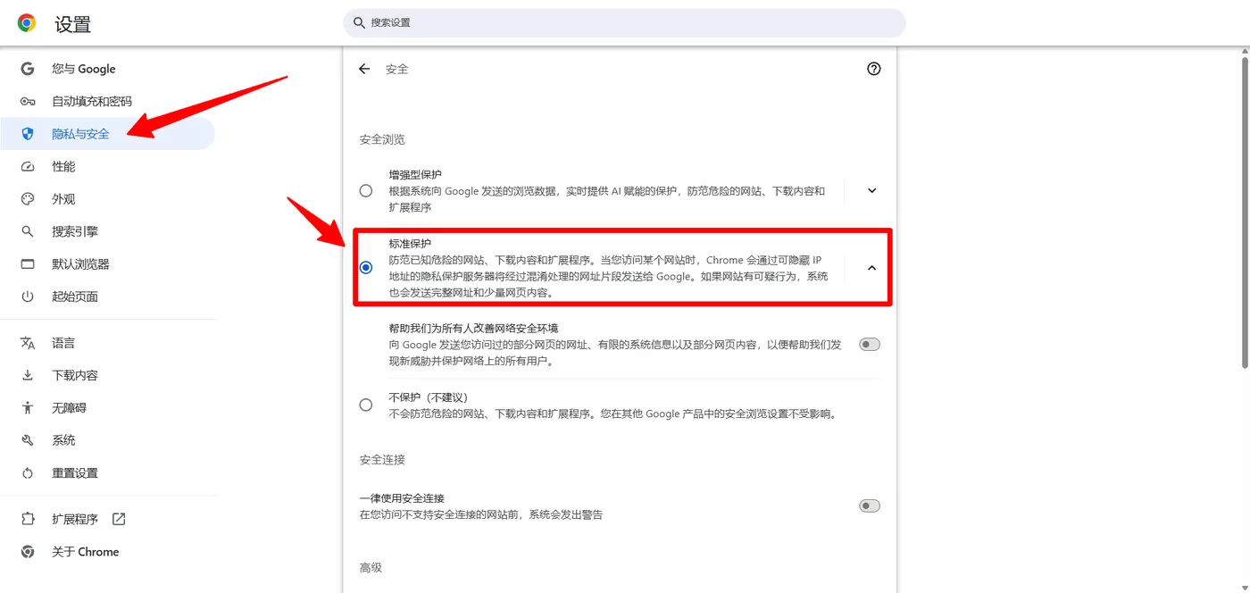 例如 [*.]域名.com.cn 这样更加安全,最后在隐私与安全中 选择标准保护 就可以了