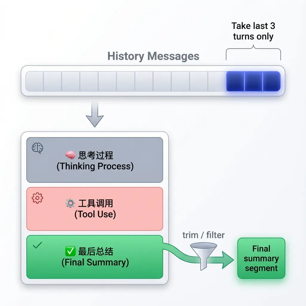 二是判断新话题无需将整个上下文都给模型。为了加快判断速度,我们只取了最近 3 轮的历史上下文用于判断,同时对模型输出的部分做了剪裁,移除模型中间的思考过程和工具调用,只取模型输出轮次的最后一段文本内容。模型最后一般都会对这次生成做一次总结,因此最后一段文本算是模型输出的摘要,对判断新话题来说已足够。