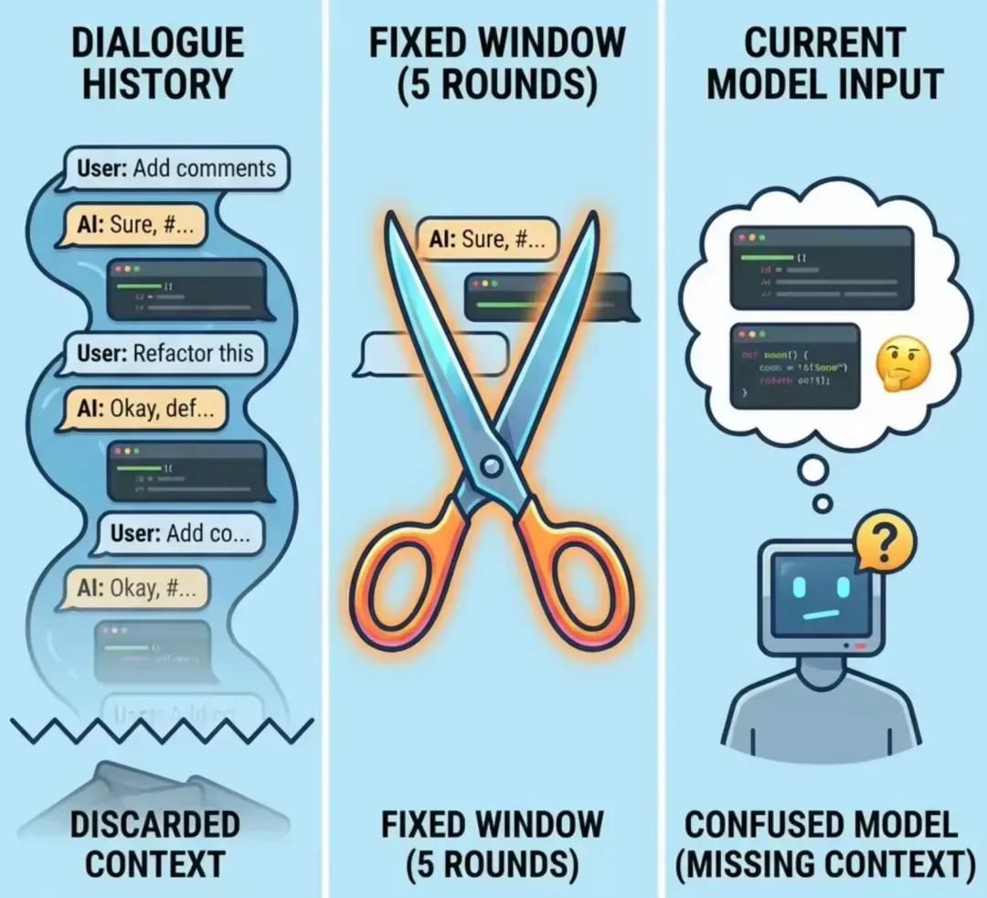 - 上下文断裂:复杂任务往往需要超过 5 轮对话才能完成,固定截断会导致前面的重要信息丢失,模型“忘记”用户的原始意图。