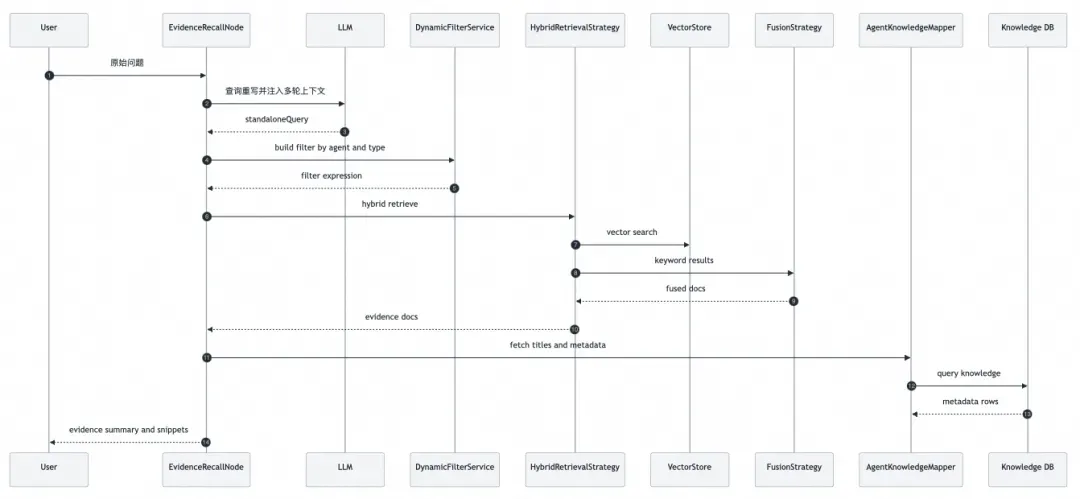EvidenceRecallNode将多轮上下文与用户问题组装为检索指令,调用 LLM 生成standaloneQuery,避免上下文遗漏与歧义。 - 召回通道: