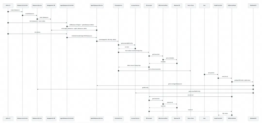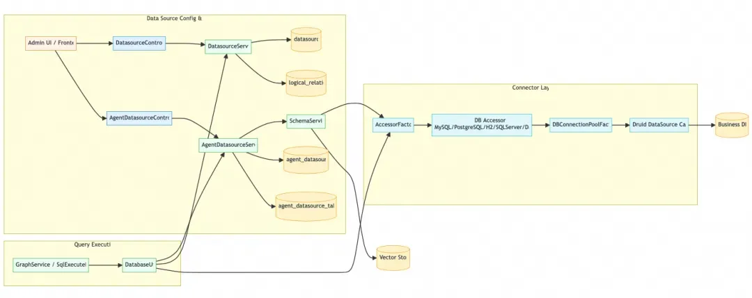 AgentDatasourceController触发初始化,SchemaService通过AccessorFactory拉取表/列/外键并写入向量库。 - 运行时选择: