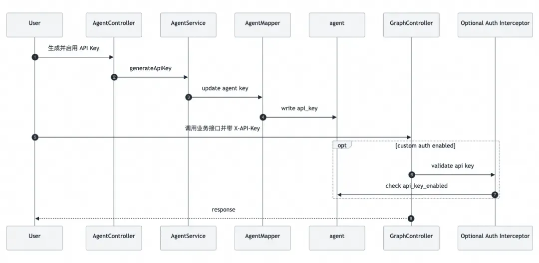 AgentController支持生成、重置、删除与启用/禁用 API Key。 - 数据字段: