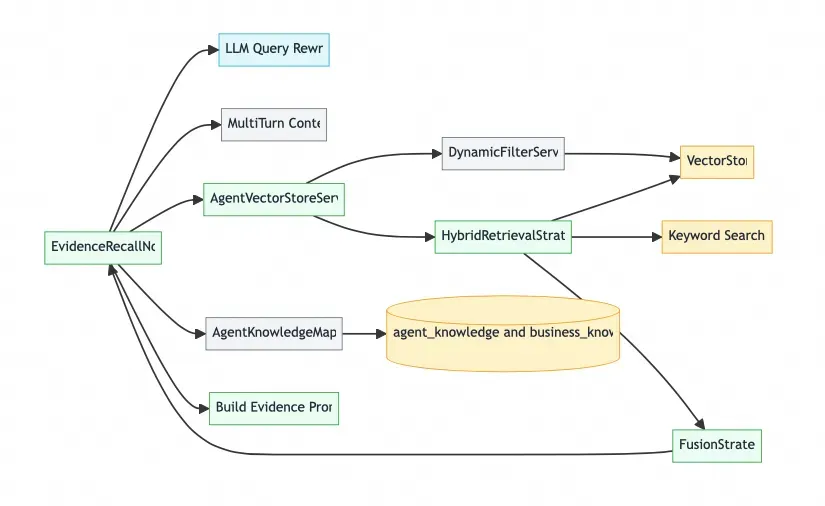 business_knowledge)+ 智能体知识(agent_knowledge)两类,按agentId/type元数据过滤后合并为 evidence,注入后续 prompt。 - 关键配置: