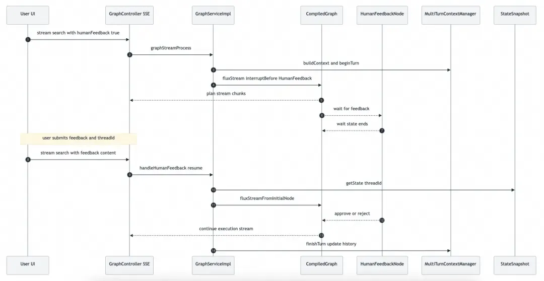 CompiledGraph使用interruptBefore(HUMAN_FEEDBACK_NODE),无反馈时进入“等待”,反馈到达后通过threadId继续执行。