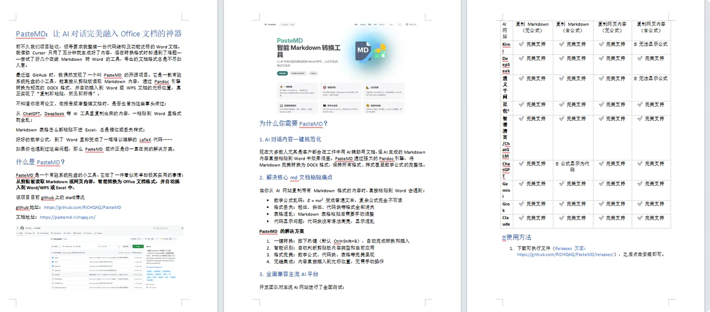 现在大多数人尤其是客户都会在工作中用AI辅助写文档,但AI生成的Markdown内容直接粘贴到Word中效果很差。PasteMD通过强大的Pandoc引擎,将Markdown完美转换为DOCX格式,保持所有格式、样式甚至数学公式的完整性。