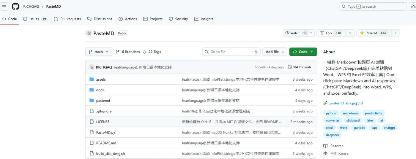最近逛 GitHub 时,我偶然发现了一个叫 PasteMD 的开源项目。它是一款常驻系统托盘的小工具,能直接从剪贴板读取 Markdown 内容,通过 Pandoc 引擎转换为规范的 DOCX 格式,并自动插入到 Word 或 WPS 文档的光标位置,真正实现了“复制即粘贴,所见即所得”。
