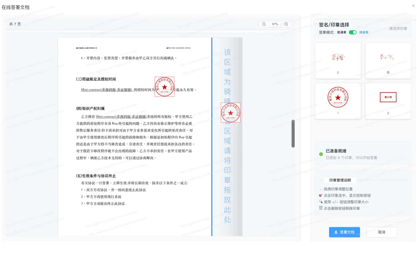- 骑缝章必须可用:跨页对齐和定位精度决定交付质量