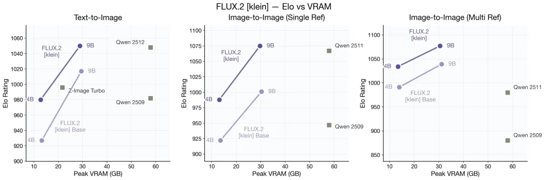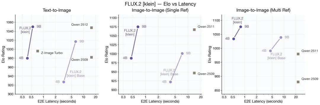 基准测试显示,FLUX.2 [klein]在Elo评分、推理延迟和显存占用三个维度上均实现了优异平衡:
