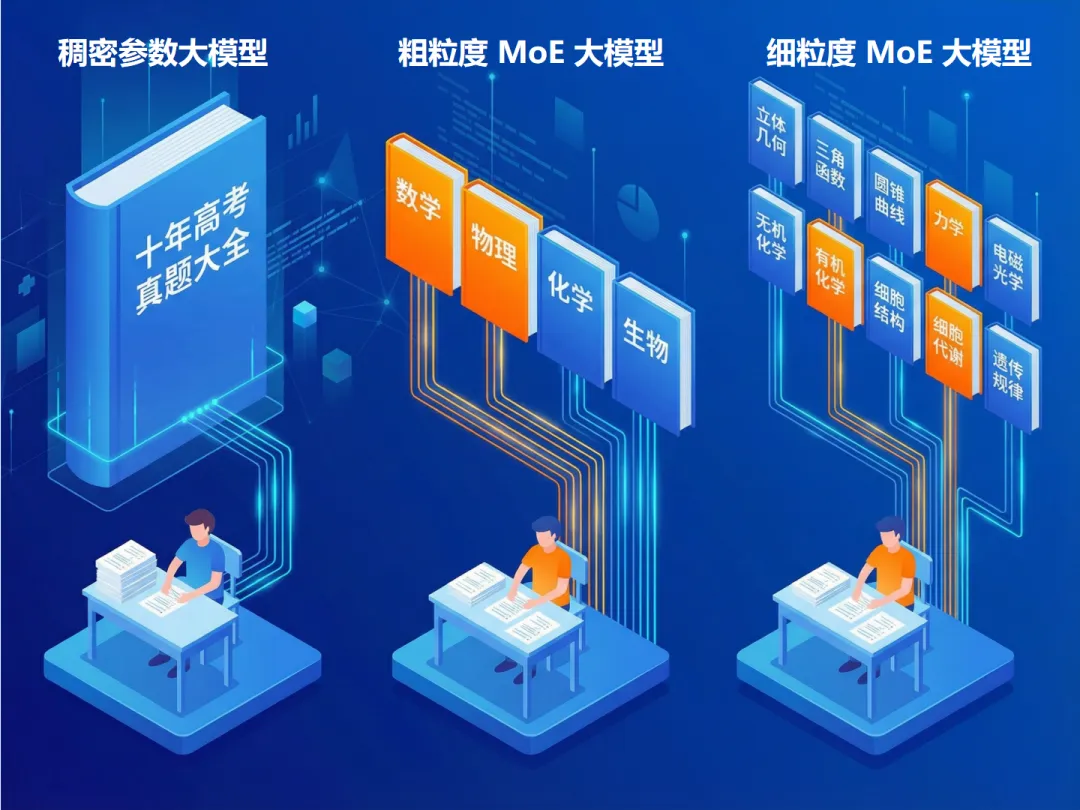 打个比方,假如大模型是个理综考生,稠密参数大模型就是从一本“十年高考真题大全”合订本里找思路,知识庞杂,效率低下。粗粒度模型,则实现了初步的学科分类和调用,减少了无效的知识调用。细粒度MoE,则是更进一步,特定的题目只调用特定的细分知识点组合,见招拆招,精准调配。