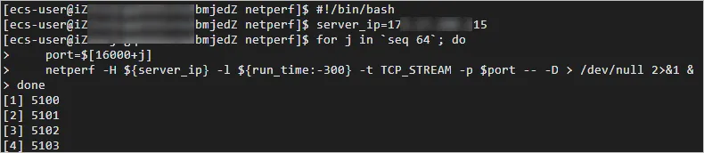 #!/bin/bash server_ip=<测试机私网IP地址> for j in `seq 64`; do port=$[16000+j] netperf -H ${server_ip} -l ${run_time:-300} -t TCP_STREAM -p $port -- -D > /dev/null 2>&1 & done