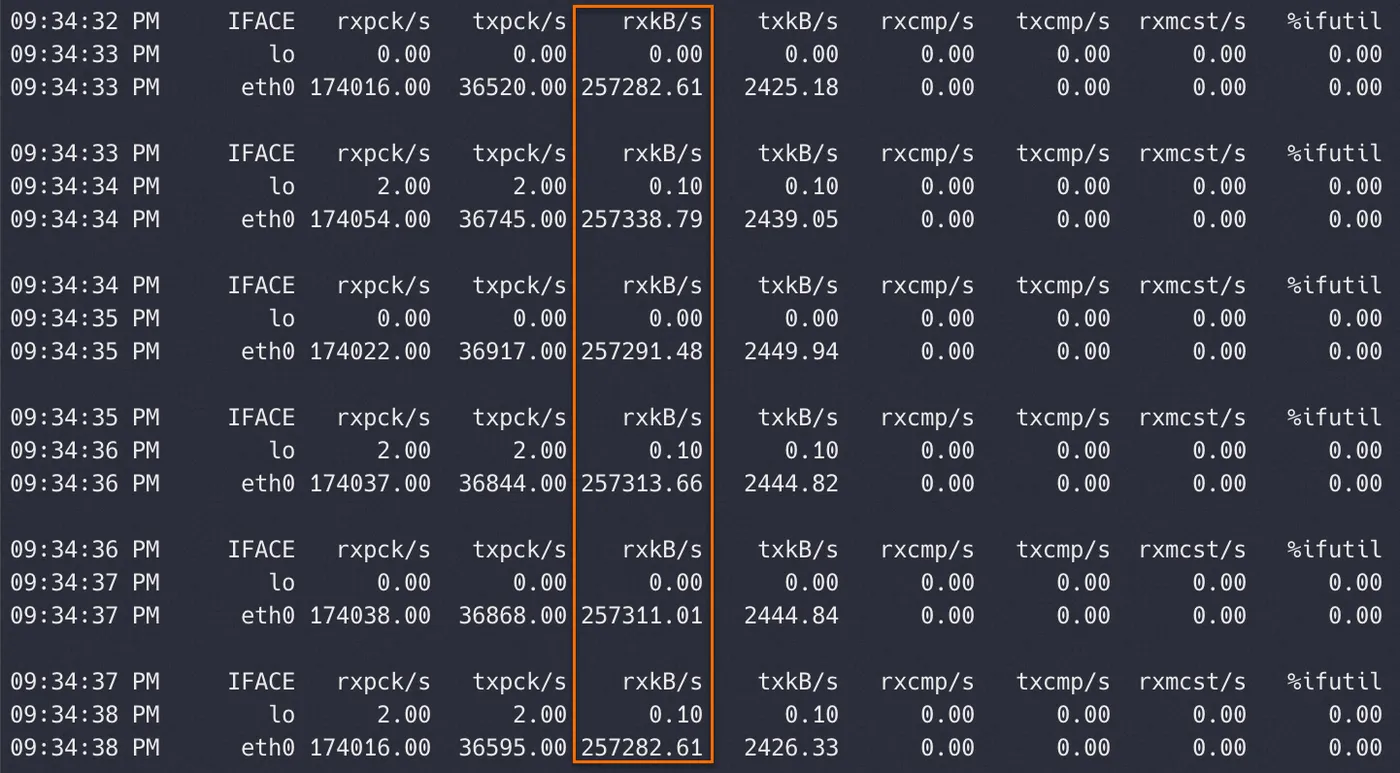 在测试结果中查看rxkB/s列的数据值,rxkB/s表示该测试机每秒钟接收的数据包的大小,单位为KB/s(千字节/每秒)。1字节等于8比特,若要计算对应的带宽值,则可将rxkB/s列对应的数值乘以8,从而将其转换为Kbps(千比特/每秒)。