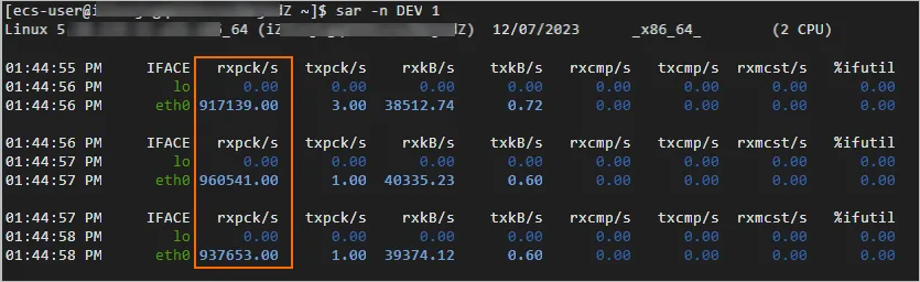 在测试结果中查看rxpck/s列的数据值,rxpck/s表示该测试机每秒钟接收的数据包总数。如下图所示,示例中测试机每秒钟接收到的数据包平均数约为94万。