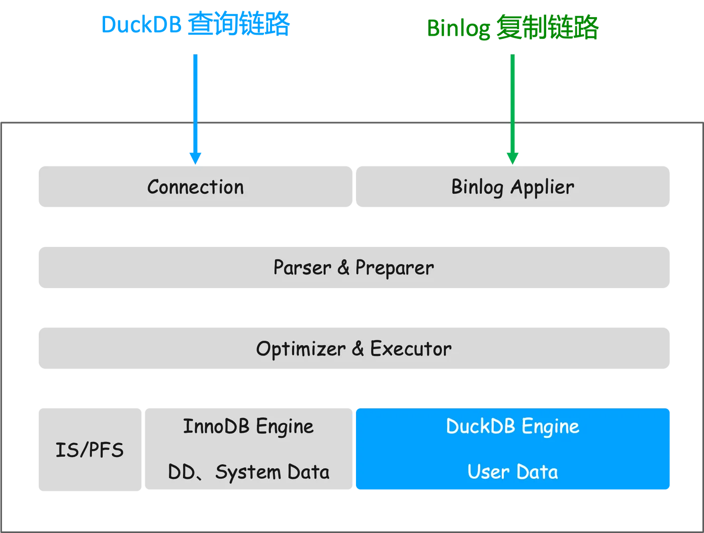 基于以上的几个原因,我们认为DuckDB非常适合成为MySQL的AP存储引擎。因此我们将DuckDB集成到了AliSQL中。