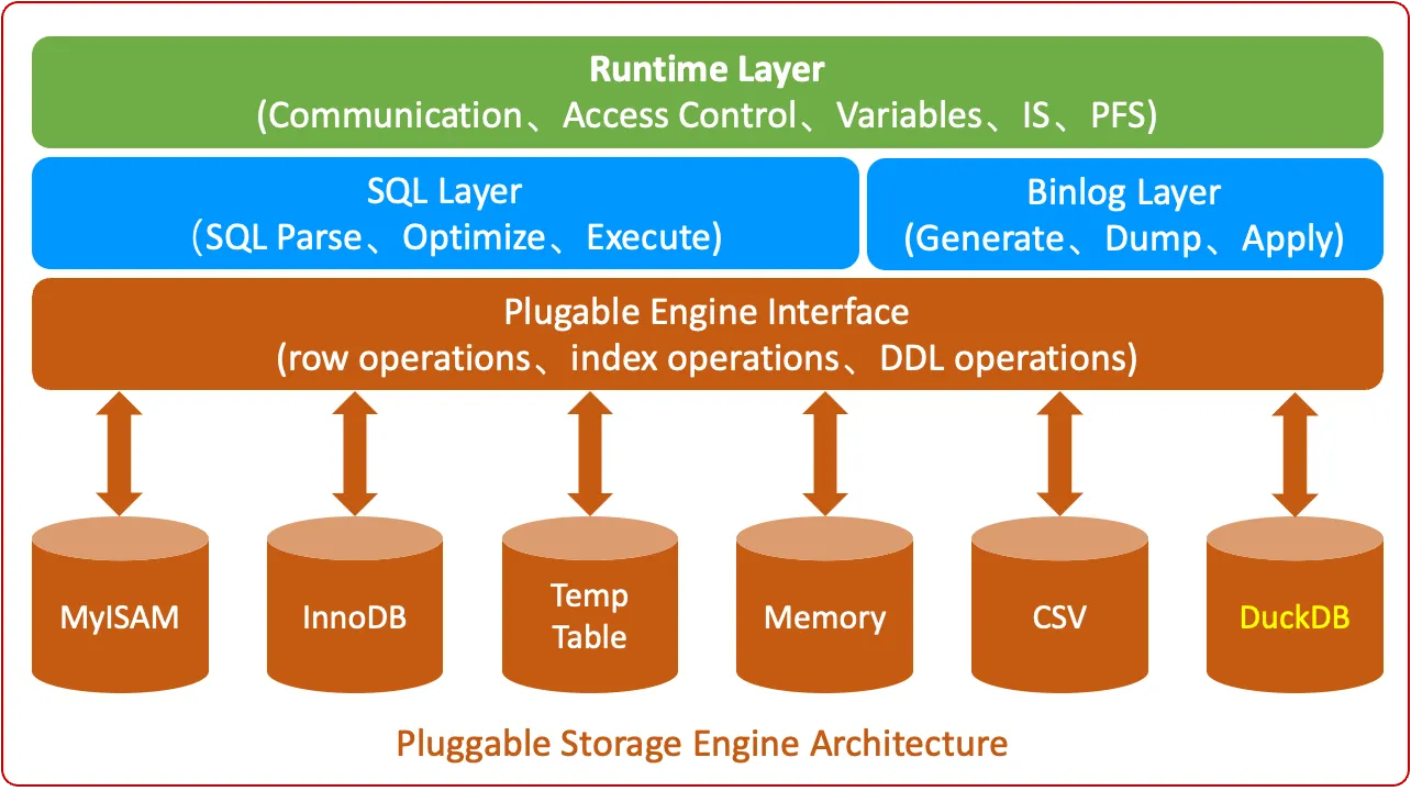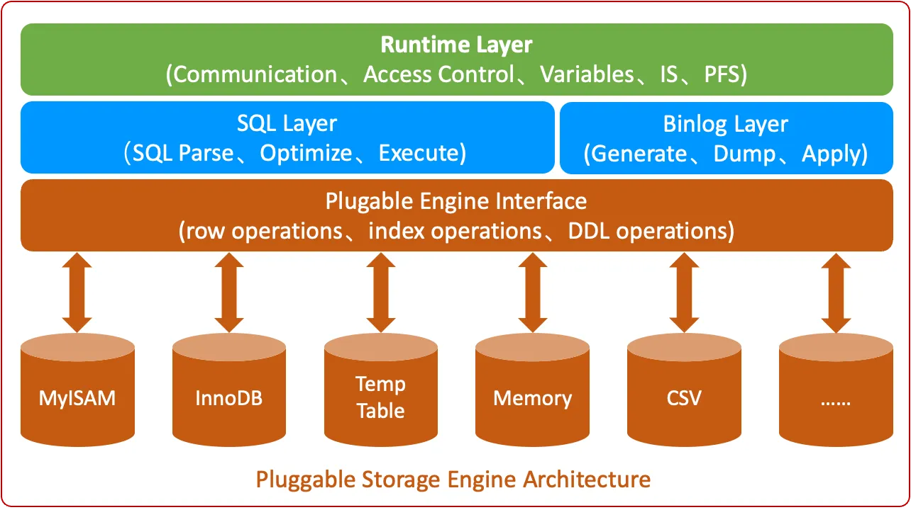 MySQL在SQL计算和数据存储之间设计了一套标准的数据访问控制接口(Plugable Engine Interface),SQL层通过这个标准的接口进行数据的更新、查询和管理,存储引擎得以作为独立组件实现“热插拔”式集成。