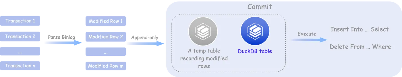 由于DuckDB不支持两阶段提交,因此无法利用两阶段提交来保证Binlog GTID和数据之间的一致性,也无法保证DDL操作中InnoDB的元数据和DuckDB的一致性。因此我们对事务提交的过程和Binlog的回放过程进行了改造,从而保证实例异常宕机重启后的数据一致性。