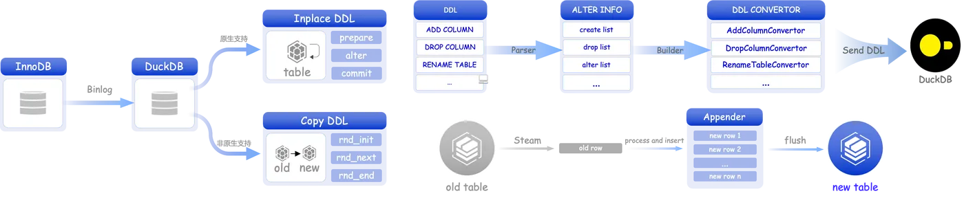 MySQL中的一少部分DDL比如修改列顺序等,DuckDB不支持。为了保证复制的正常进行,我们实现了Copy DDL机制。DuckDB原生支持的DDL,采用Inplace/Instant的方式执行。当碰到DuckDB不支持的DDL时,会采用Copy DDL的方式创建一个新表替换原表。