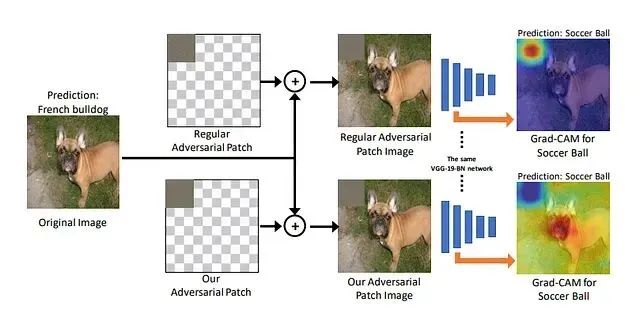 下图展示了一个有趣的现象:在法国斗牛犬的图像上添加一小块对抗性补丁后,VGG分类器竟然以极高的置信度将其判定为足球。Grad-CAM可视化清楚地显示,模型的注意力完全从狗身上转移到了那块补丁——一个精心构造的小扰动就足以劫持整个决策过程。