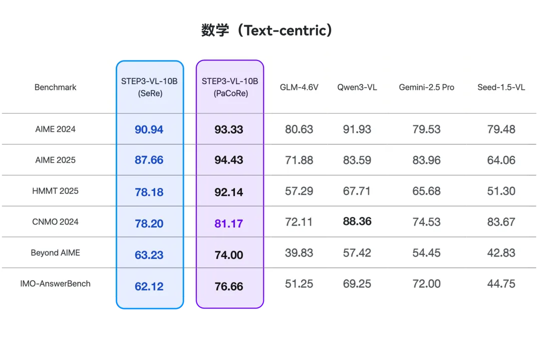 在数学维度上,Step3-VL-10B 表现尤其突出。在 AIME 25/24 等数学竞赛测试题上以几乎满分的成绩达到世界第一梯队水平。
