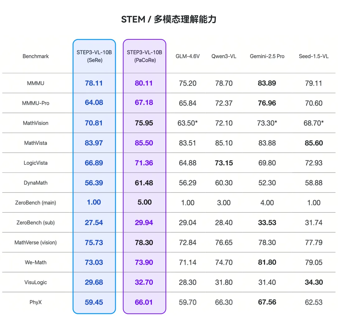 Step3-VL-10B 在 MMMU、MathVision 中超越 GLM-4.6V、Qwen3-VL 等模型。
