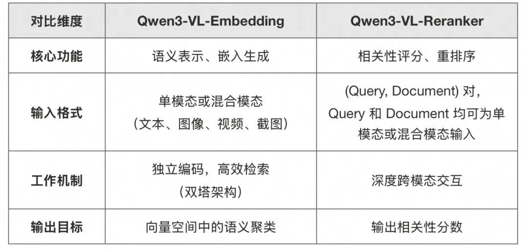 - 高精度重排序(Reranker):我们同步提供Qwen3-VL-Reranker系列作为 Embedding模型的补充。Qwen3-VL-Reranker接收输入对(Query, Document), 其中查询和文档均可包含任意单一或混合模态——并输出精确的相关性分数。在实际检索场景中,Embedding和Reranker模型通常协同工作:Embedding模型负责初始召回阶段,Reranker模型负责重排序阶段,这种两阶段流程显著提升了最终检索精度。