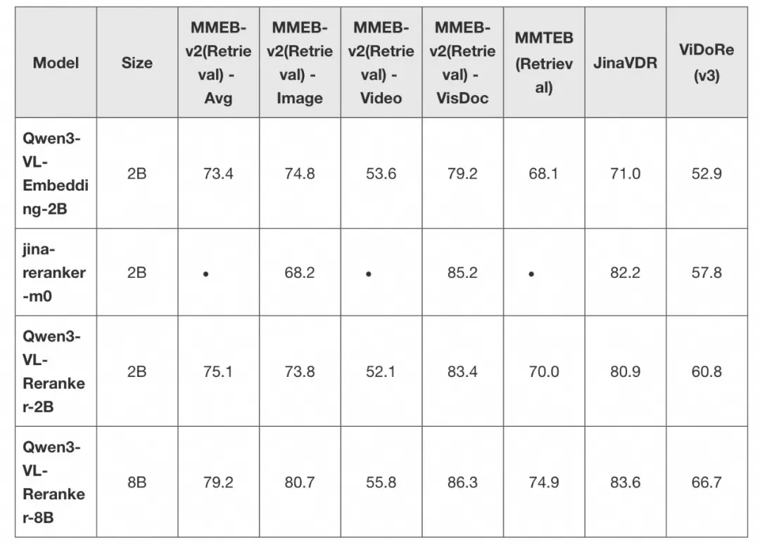 评测结果表明,所有Qwen3-VL-Reranker模型的性能均持续优于基础 Embedding模型和基线Reranker模型,其中8B版本在大多数任务中达到了最佳性能。