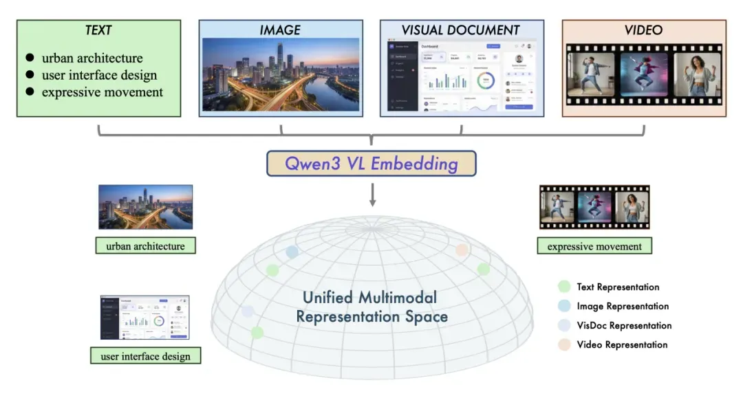 图1:统一多模态表示空间示意图。Qwen3-VL-Embedding模型系列将多源数据(文本、图像、视觉文档和视频)映射到共同的高维语义空间。