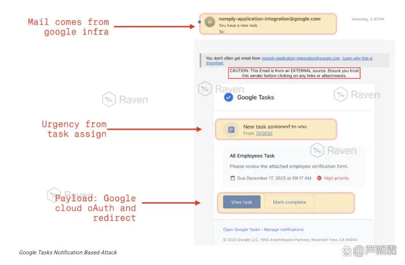 此次攻击的关键特征在于:所有钓鱼邮件均由Google官方基础设施发出,使用经认证的mailto:noreply-application-integration@google.com地址,并通过完整的邮件身份验证链。邮件内容模拟Google Tasks的任务分配通知,包含“View task”或“Mark complete”等标准操作按钮,点击后跳转至伪装成Google登录页的Cloud Storage静态页面。由于整个链路(发件服务器、域名、TLS证书、内容模板)均属合法,企业邮件网关普遍将其标记为低风险甚至直接放行。据Cyber Press报道,制造业成为主要受害行业,因其广泛采用Google Workspace进行跨地域协作,且对自动化通知接受度高,警惕性相对较低。
