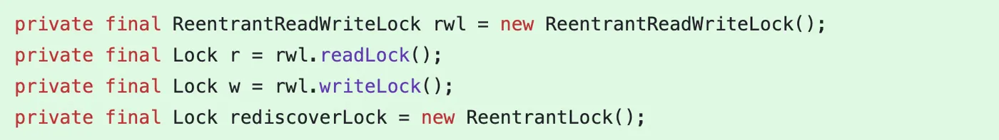 2. 第二层锁使用ReentrantReadWriteLock,主要用来控制连接池的的读写,但加入写锁之后,将会block外部API请求,直到更新完毕连接池,从而实现并发安全访问。