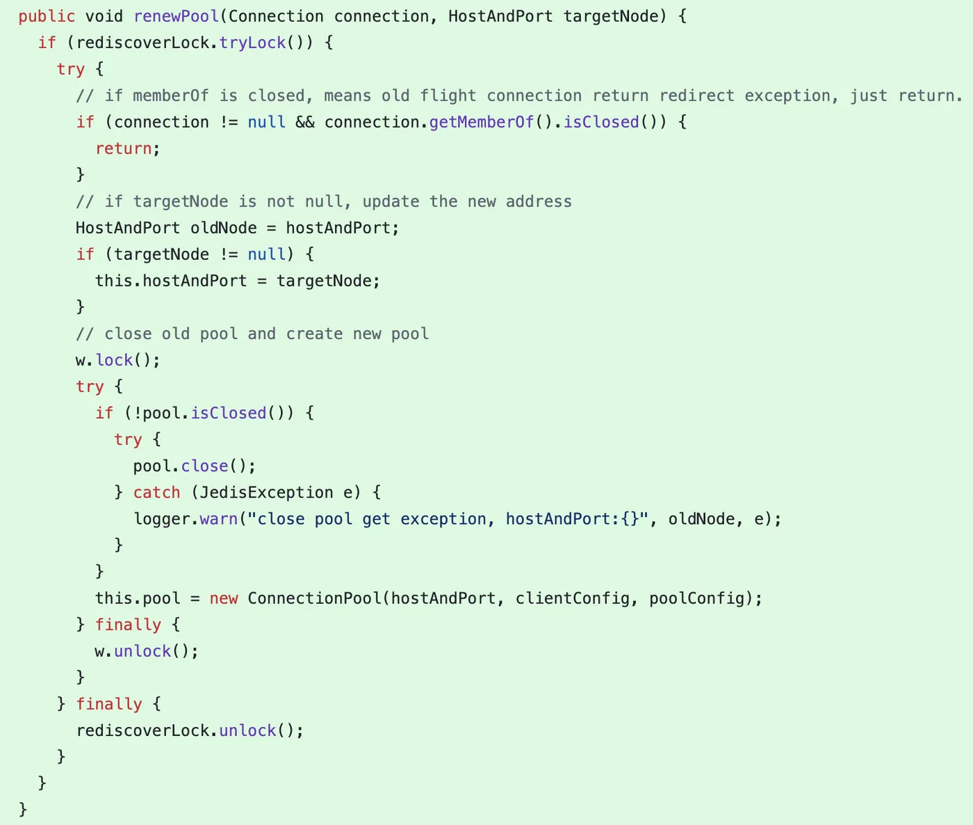在支持无感切换的过程中,特别解释下如何处理 in flight 的连接:即对于连接池中同时并发访问的链接,如果某条或者多条同时遇到了-REDIRECT之后,通过一个二段锁来控制重新初始化连接池的过程: