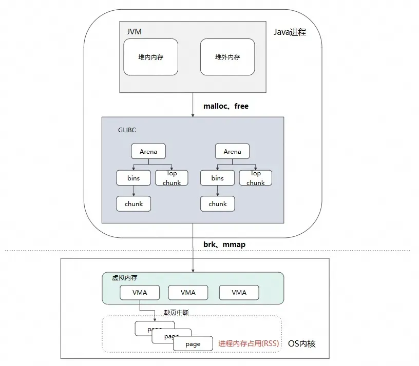 JVM 向 OS 申请内存的中间,还存在着一层中间层 -C 库,JVM 调用 malloc、free 申请/释放内存的过程中其实还要经过这一个二道贩子;以 gibc 中默认的内存分配器 ptmalloc 为例 glibc 的 ptmalloc 内存分配器存在以下特征: