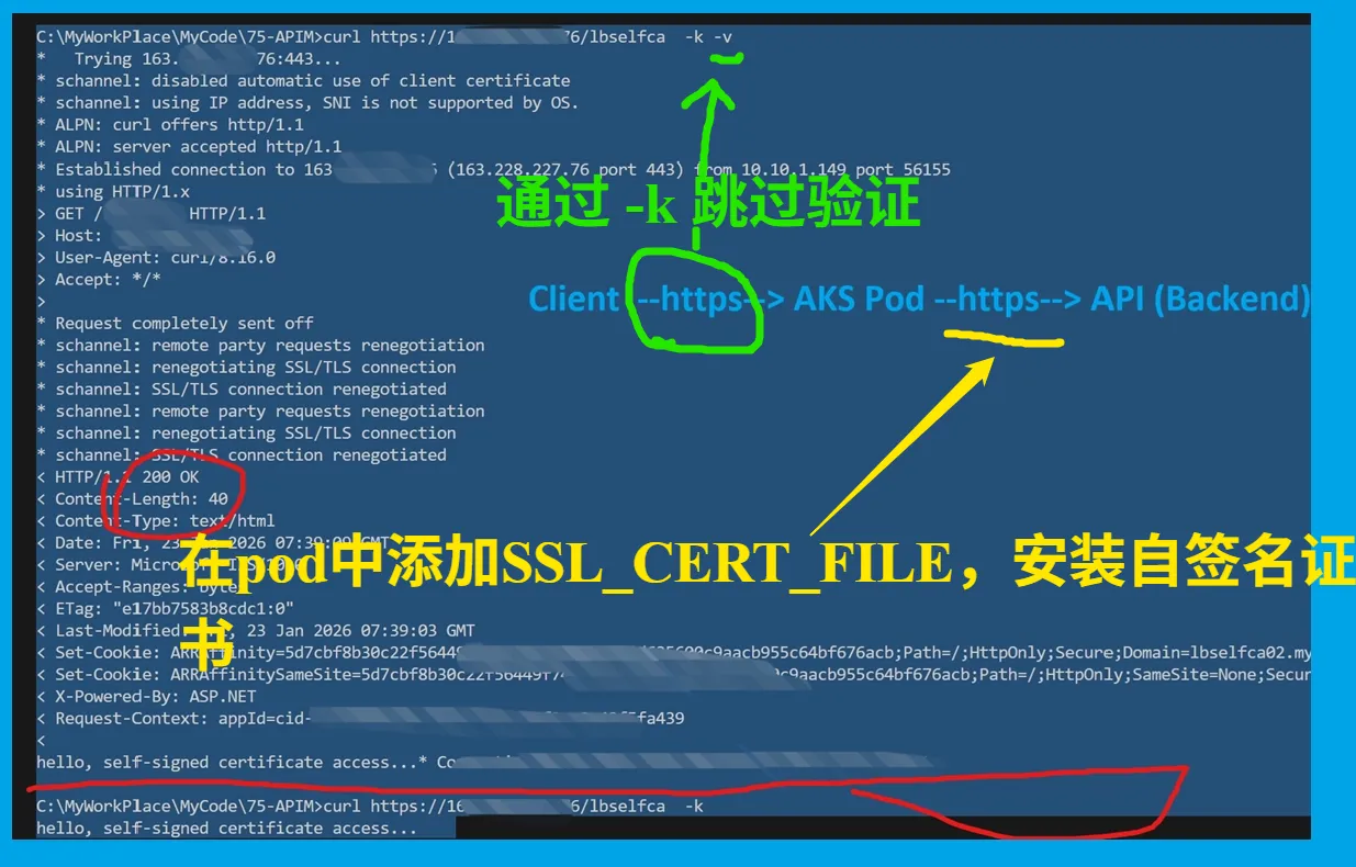 经过AI大模型解答,在 AKS (Azure Kubernetes Service) 中访问使用自签名证书的 API,关键在于让客户端信任该证书,主要的思路是: