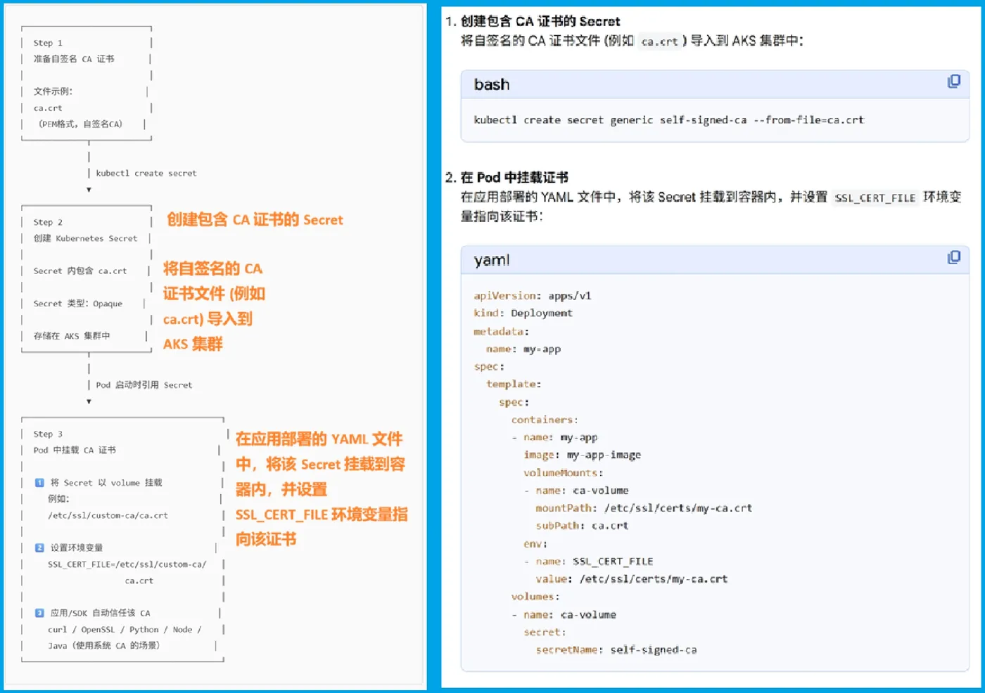 3. 在应用部署的 YAML 文件中,将该 Secret 挂载到容器内,并设置 SSL_CERT_FILE 环境变量指向该证书