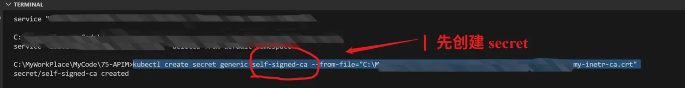 kubectl create secret generic self-signed-ca --from-file="<the full path of my-inetr-ca.crt>"