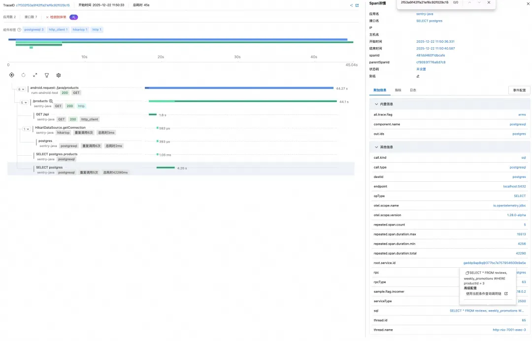 点击链路中的最后一个 Span,我们可以在右侧详情面板中看到具体执行的 SQL 语句: