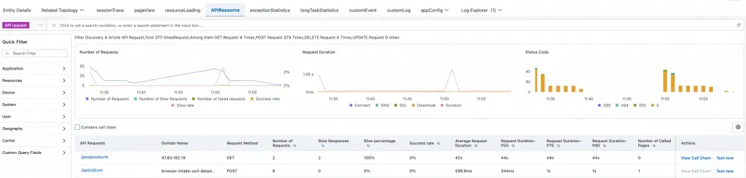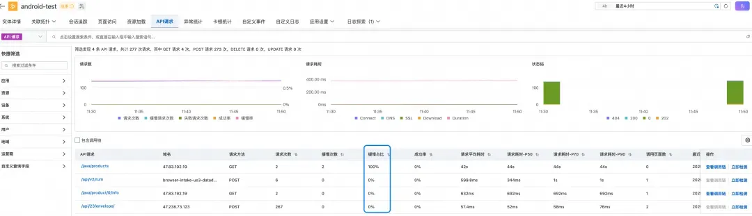 首先,我们登录阿里云控制台,进入云监控 2.0 控制台 → 用户体验监控 →您的应用 → API 请求模块。在这里,我们可以看到所有 API 请求的性能统计数据。