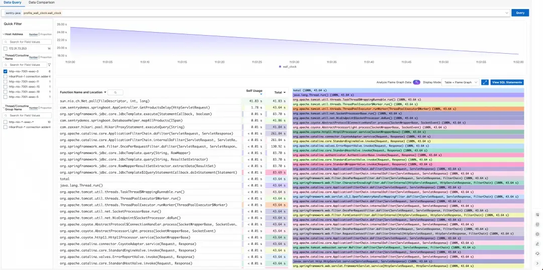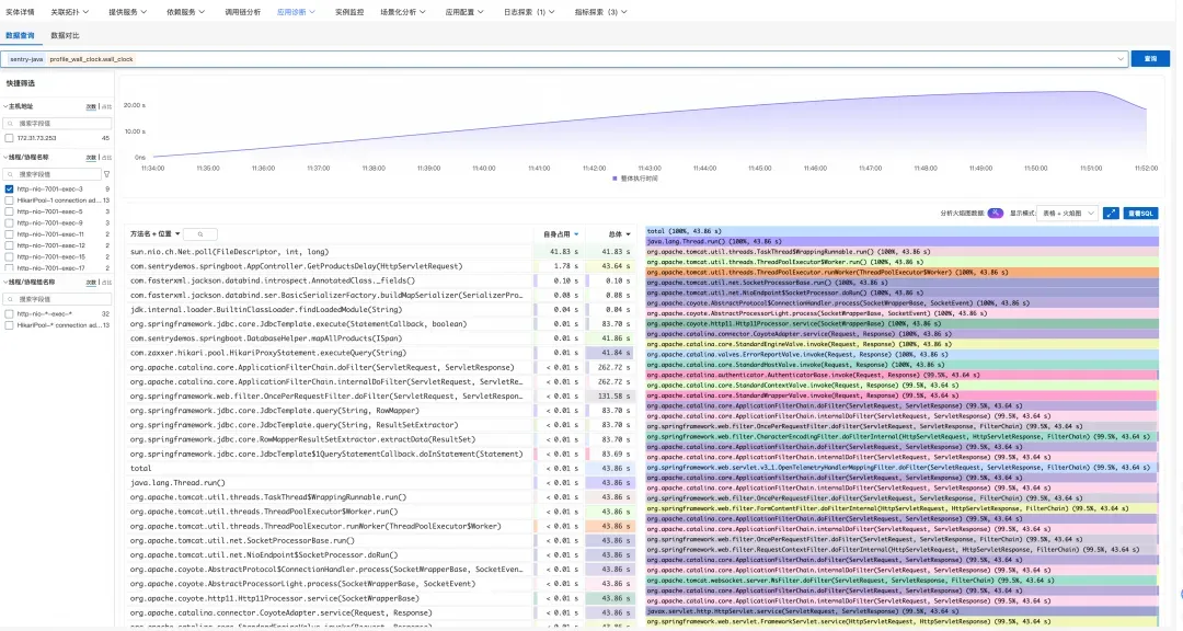 Profile 数据与调用链分析的结论完全吻合——问题确实出在数据库查询上,线程一直在等待慢 SQL 的执行结果。