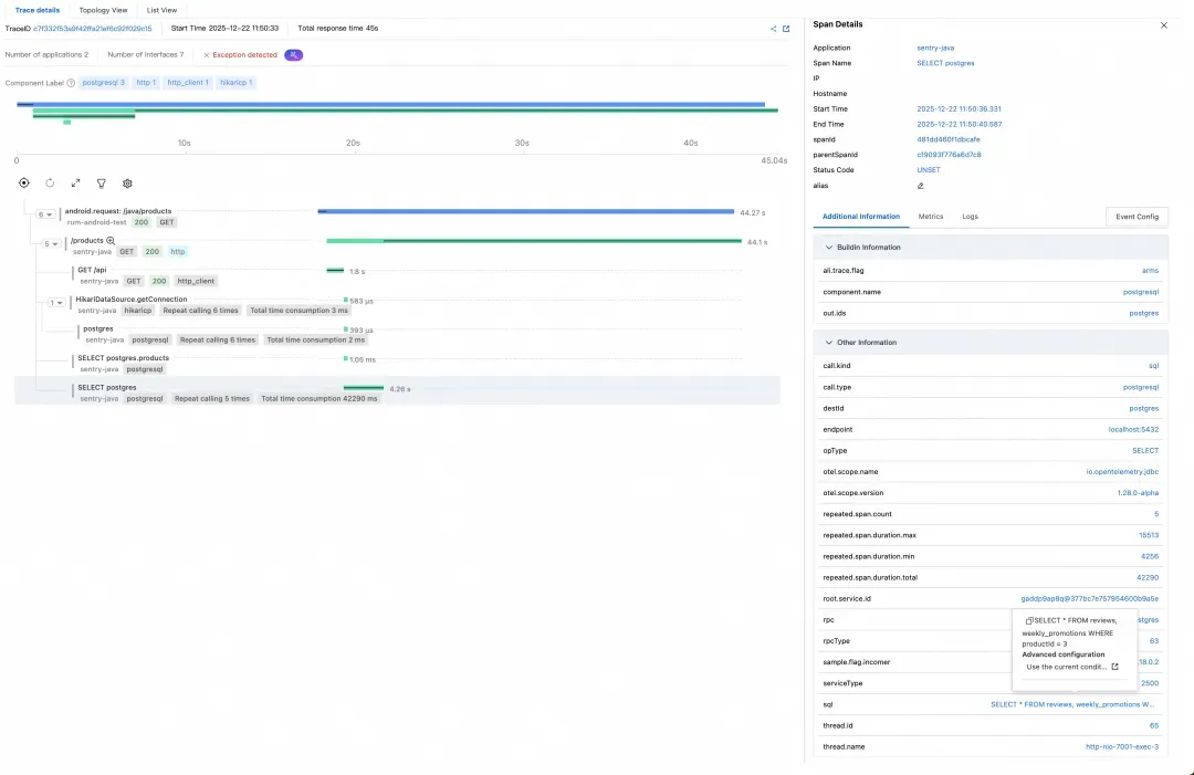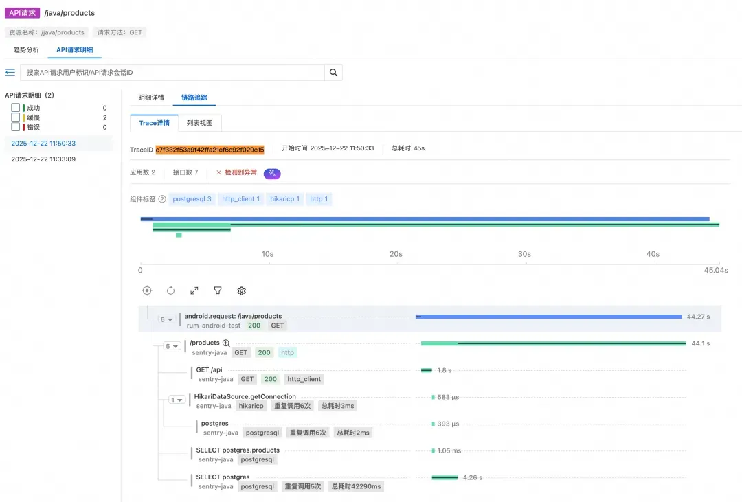 这里就是端到端链路打通的核心价值所在——我们可以直接看到从移动端到后端的完整调用链路,无需在多个系统之间来回切换。