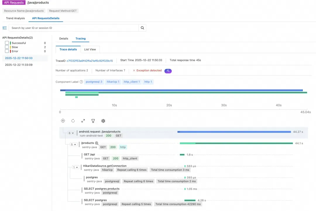 从监控数据可以清晰地看到,API /java/products 的响应时间异常——平均耗时高达 40 多秒!这个耗时远远超出了正常范围,难怪用户会感觉页面打开缓慢。
