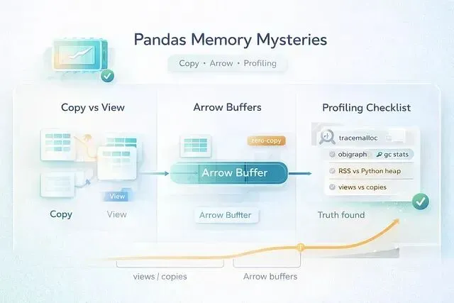 pandas 的"内存泄漏"多数时候是下面几种情况:视图或切片持有大缓冲区的引用导致无法释放;Copy-on-Write 机制让数据共享的时间比预想的长;Arrow 或其他原生分配器即使对象释放后仍保留内存池;缓存、列表、闭包、长期任务导致对象被意外持有。