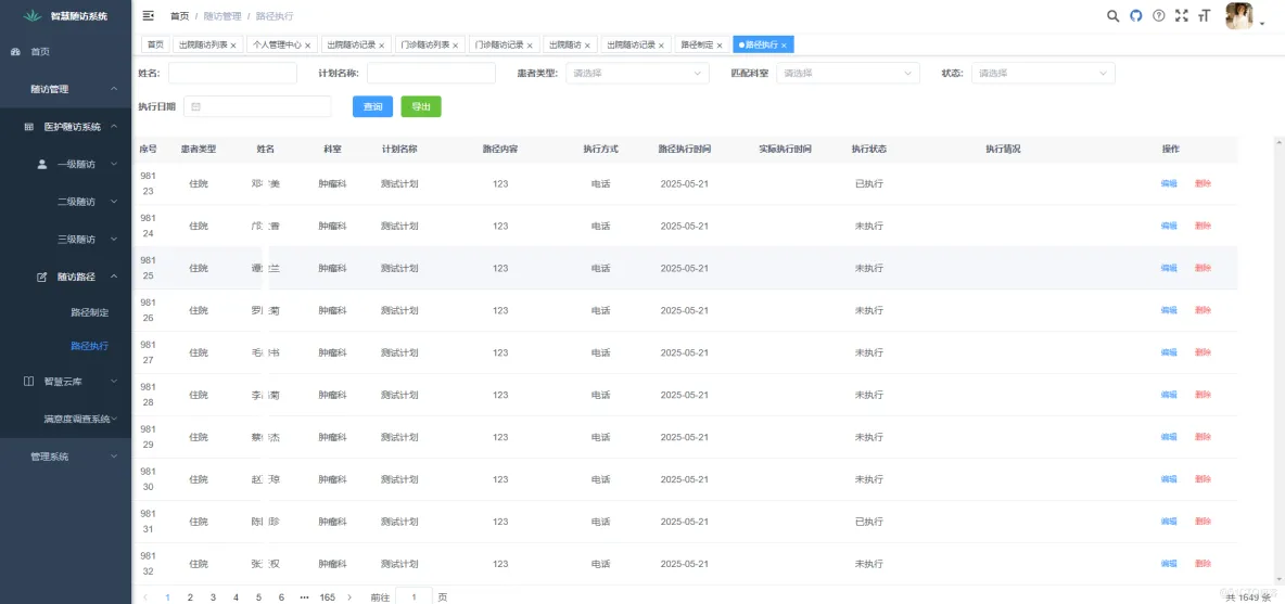 对已匹配随访路径的患者进行统一管理,支持按科室、姓名、状态等多条件查询,并允许在线维护患者信息或调整路径匹配。