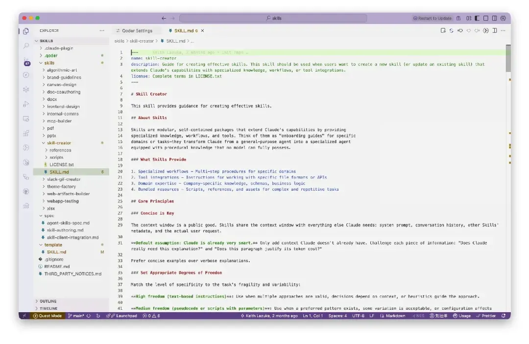 当然,我们也可以通过 Qoder 或 Cursor 把 Claude 的Skills 仓库压缩成一个 Skill 模板,后续作为 AI Coding 工具的项目 Rule,再让 AI Coding 工具拿到这个规则和我们的需求和上下文,帮我们生成也可以。