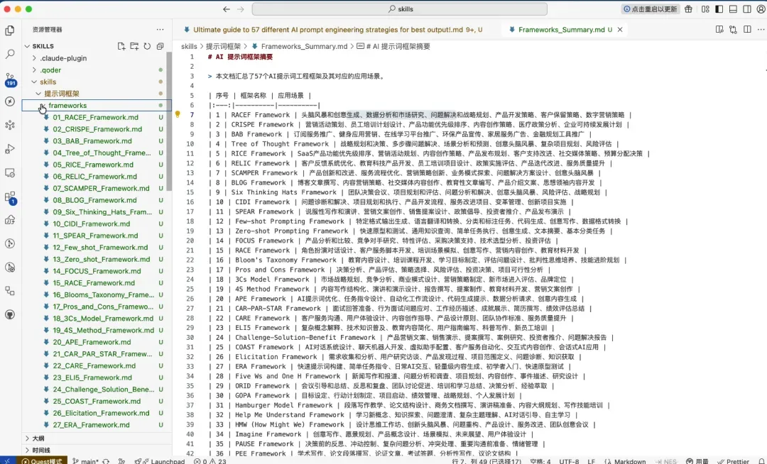 我们把所有框架准备一份摘要 Markdown(摘要也是使用  Qoder 或 Cursor 这类工具, 根据 57个框架自动汇总出来的)。