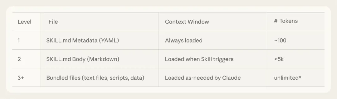 SKILL.md 中 YAML 的元信息,总是会放到上下文中, Body 部分在技能触发的时候才会加载,要小于 5K,其他的文件(文本文件、可运行的脚本、数据等)没有限制。