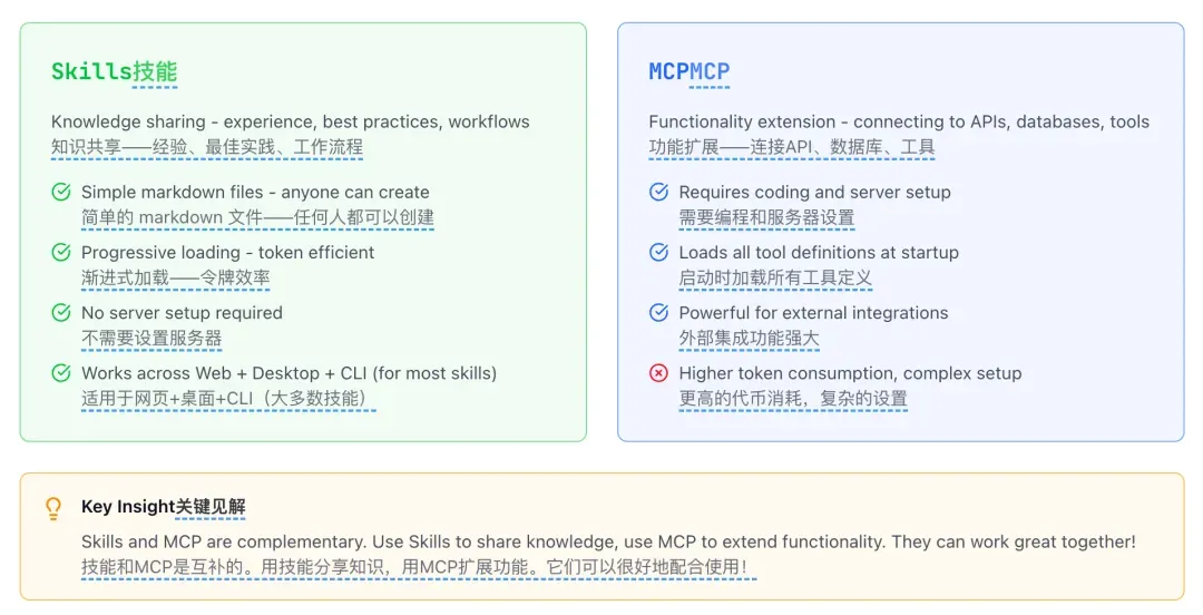 两者是互补的关系,Agent 可以通过 Skills 获取知识,通过 MCP 拓展功能。